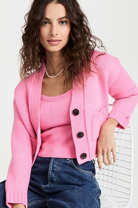 "Just like the rest of the fashion crowd, I'm obsessed with Barbie pink right now and this cardigan is ticking all my boxes. I love how you can easily get two styles out of it by throwing it on over a tank (or better yet, the matching version) or leaving it buttoned up. Also, a girl can never have too many extra pockets." – BK