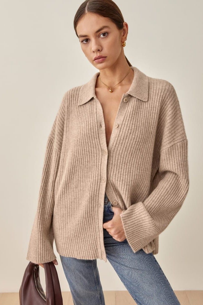 "This sweater has me immediately wanting to curl up next to a fire with a good book. It's made of cashmere, which makes it so soft that it could probably double as a blanket in a pinch. It also looks just as good buttoned up as it does open and the beige color hits on one of fall 2022's biggest trends." – BK