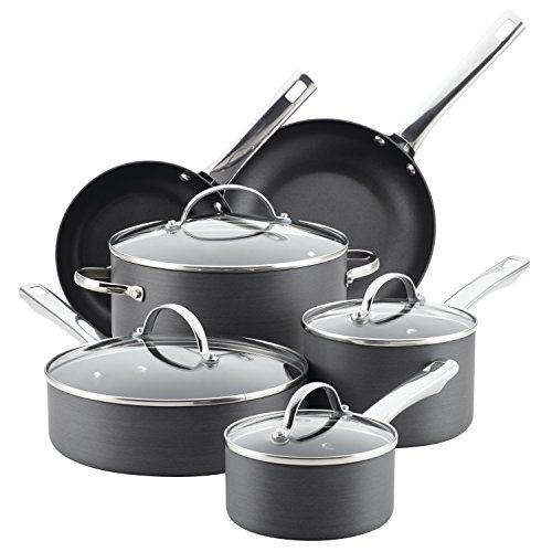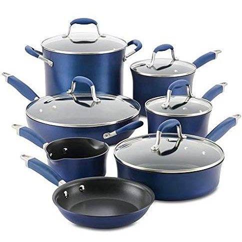 The Rachael Ray Hard Anodized pans (made without Teflon) landed high scores in our tests for heat distribution and staining. They also scored high for easy release and browning. The two small pots are great for boiling eggs and heating soups, and the silicone-grip handles make moving them around easy. They’re a popular seller on Amazon with colors like red, light blue, and orange. The slotted spoon and fish spatula are a useful bonus.