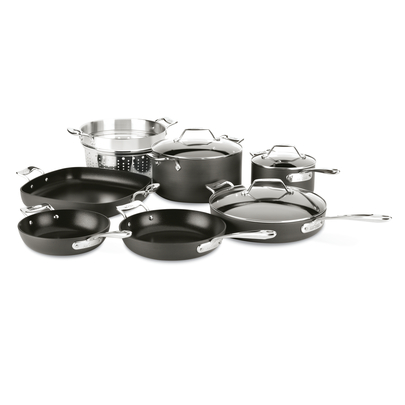 The All Clad NS1 Nonstick Cookware Set was a top performer in our cookware tests. It heated evenly, prevented food from sticking, and browned meat very well. Now, trusty All Clad released a new nonstick line that could also go in the oven up to 500°F. We’re fans of sets like these that include small and medium sauteé pans, both of which fit into the larger pan for storage. We also like that each pan has a helper handle, which allows for easy movability. The 13-inch square pan is a unique size, ideal for browning and then braising or baking; it can be stored under the large skillet, while the pots can be stored on top of the in a compact fashion. The entire set is dishwasher safe and Teflon-free.
