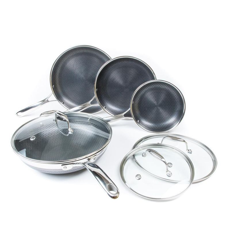 Even professional chefs rely on nonstick skillets to cook tricky items like eggs and fish. It’s evident that HexClad knows that from looking at their product line, which only includes skillets and one wok. Unlike traditional nonstick pans, they’re designed to withstand high temperatures in order to achieve a good sear. They can also go in the oven up to 500°F and can be used with metal utensils. We use our 8-inch pan to fry crispy eggs in olive oil all the time. We also use it to make fluffy scrambled eggs with butter. HexClad pans boast a patented hexagon design that’s laser etched onto the inside and outside of the pan. This layer provides the nonstick attribute, while still allowing the pan to get very hot and cook evenly thanks to its stainless steel base and aluminum middle layer. The design on the outside helps prevent staining and allows for easier cleanup. Hex Clad pans are Teflon-free.