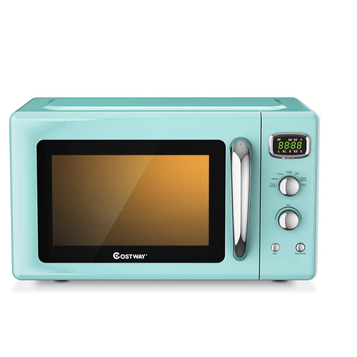 COSTWAY offers a retro vibe that gives you that pizzazz your kitchen so desperately needs. The microwave is a very petite 0.9 cubic feet wide, which makes it a perfect space-saving pick for smaller kitchen spaces. Plus, it comes in this cool city blue hue, as well as other fun options like mint, red, white, and cream.
