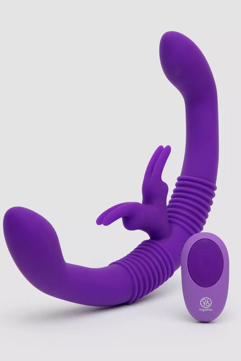 This toy is not only perfect for two partners with vaginas, but it's also remote-controlled and has multiple speed and vibration options. It has a five-star rating, too, with one reviewer gushing, "If you love rabbit vibrators and that dual stimulation sensation and are looking for a way to please both you and your partner at the same time then look no further!!!"