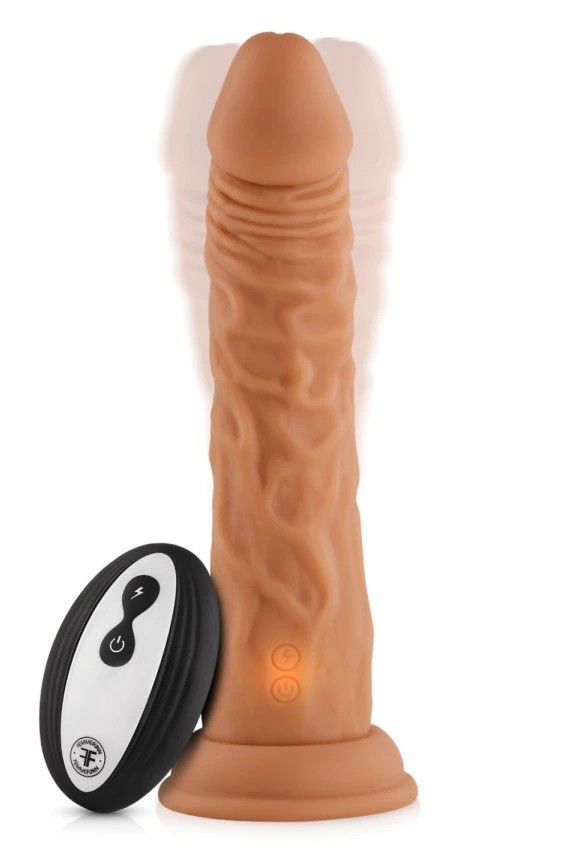 This remote-controlled vibrating dildo is great for convenient solo or partner play. One happy customer writes, "This has quickly become my favorite. I like the vibration and movement as well as the material. My girlfriend says it is comfortable to wear in a harness and can enjoy the vibration as well. It was a great purchase."