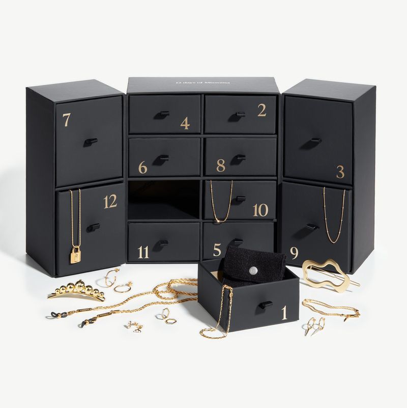 Missoma's best-selling advent calendar is back and includes the Meghan Markle–beloved brand's mini spike charm hoops, gold bobble chain anklet, gold sphere hair clip, and more, making the advent calendar worth more than $1,000. It's currently out of stock online, but watch this space for updates.
