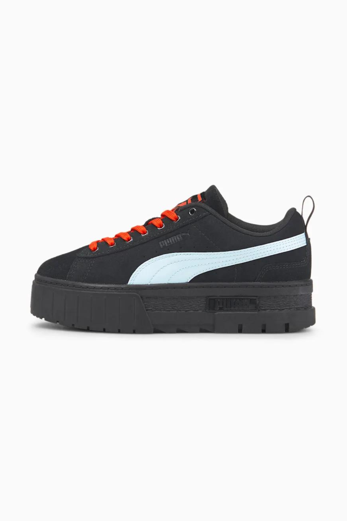 Puma’s ongoing collaboration with Dua Lipa has birthed yet another amazing black sneaker, this time a suede platform pair that comes decked out with a few neon stripes along the side.